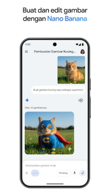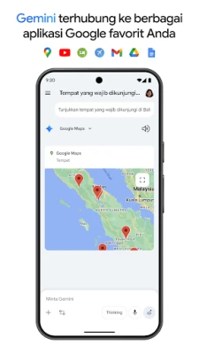 Melampaui sekadar percakapan, Gemini adalah studio ide pribadi Anda. Dengan Canvas, wujudkan konsep dari gagasan awal hingga prototipe nyata, baik itu aplikasi inovatif, permainan menarik, desain halaman web, infografis informatif, atau ringkasan audio. Kembangkan kreativitas visual Anda lebih jauh dengan kapabilitas pembuatan dan pengeditan gambar yang memukau, didukung oleh Nano Banana Pro yang dikembangkan dari Gemini 3; ciptakan maket, poster tajam, atau diagram kompleks hanya dengan beberapa kata dan gambar. Selain itu, optimalkan produktivitas Anda dengan menghubungkan Gemini ke layanan Google favorit seperti Penelusuran, YouTube, Google Maps, dan Gmail, serta ubah pembelajaran menjadi pengalaman yang interaktif melalui kuis, flashcard, dan elemen visual yang kaya.