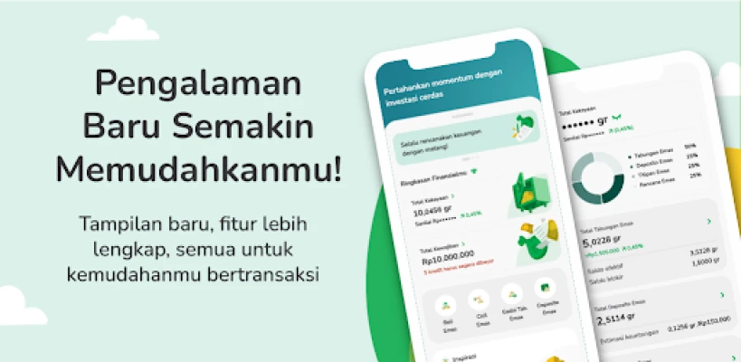 Butuh dana mendesak? Manfaatkan layanan Gadai yang kini semakin praktis dengan penjemputan aset langsung ke lokasi Anda. Nikmati fleksibilitas tenor mulai dari 120 hari hingga 36 bulan dengan sewa modal kompetitif. Bagi Anda yang ingin berinvestasi, Cicil Emas Batangan 24K tersedia dengan beragam denominasi (0.5 hingga 25 gram) serta uang muka ringan, bisa dicicil hingga 36 bulan. Atau mulailah perjalanan investasi Anda dengan Tabungan Emas, memungkinkan Anda membeli, menjual, dan bahkan mencetak emas fisik mulai dari nominal kecil. Tabungan Emas juga menawarkan fitur Rencana Emas serta opsi Gadai Tabungan Emas untuk kebutuhan tak terduga, dengan sewa modal minimal dan proses cepat.