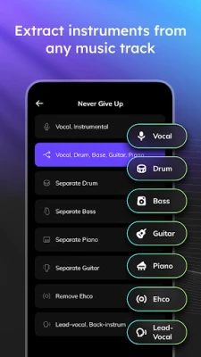 Lebih dari sekadar penghilang vokal, Musiclab adalah kotak perkakas lengkap untuk kreativitas musik Anda. Ingin menghilangkan drum untuk menciptakan irama baru, atau mengisolasi bass untuk fokus pada melodi? Aplikasi ini memungkinkan Anda dengan mudah menonaktifkan atau bahkan memperkuat volume instrumen spesifik seperti drum, bass, piano, atau gitar. Selain itu, fitur peredam kebisingan internal memastikan kualitas audio Anda jernih dan bebas gangguan. Rekam, latih, atau ciptakan kembali karya musik Anda dengan presisi, lalu bagikan hasil mix atau trek terpisah Anda dalam kualitas audio tinggi, siap untuk kreasi selanjutnya atau sebagai bahan latihan yang sempurna.